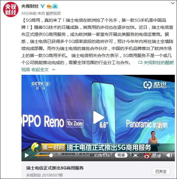 据新华社此前报道,中国手机品牌OPPO 4月24日在瑞士苏黎世宣布,与瑞士电信公司在5G商用服务领域开展合作,成为瑞士电信首批5G合作伙伴之一。