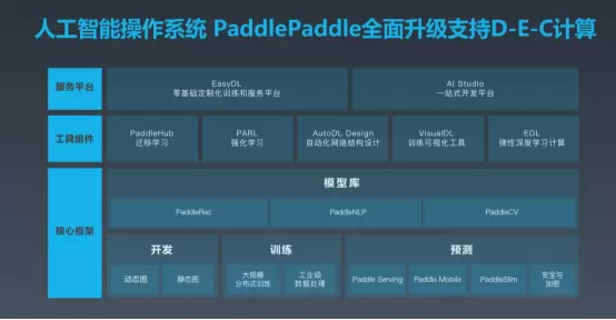 在芯片、基础设施、性能优化之上,百度打造了国内唯一完整、全套的深度学习平台PaddlePaddle。PaddlePaddle包括核心框架、工具组件和服务平台三大部分。在核心框架层面,它可以提供开发、训练和预测一整套的技术能力;在此之上,又提供了包括视觉、自然语言等在内的丰富模型,形成完整的模型库,通过模块化的方式提供给使用者,以及包括迁移学习、强化学习、自动化网络结构设计、训练可视化工具、弹性深度学习计算等在内的工具组件;而在服务平台层面,PaddlePaddle则提供了零基础定制化训练和服务平台EasyDL和一站式开发平台AI Studio。通过一整套的框架和服务,百度可以帮助广大开发者和企业利用工具化、平台化的方式,降低深度学习应用门槛,加速推动产业智能化变革。