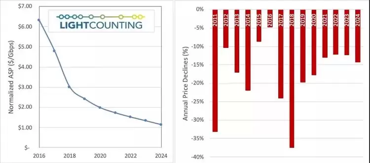 2017-2018年对100GbE以太网收发器的需求非常强劲,但价格大幅下跌限制了销售收入的增长。下图中的左图显示了2016-2024年整个以太网段每Gbps的标准平均价格。图中右边的图表显示了2011-2024年的价格幅度变化。