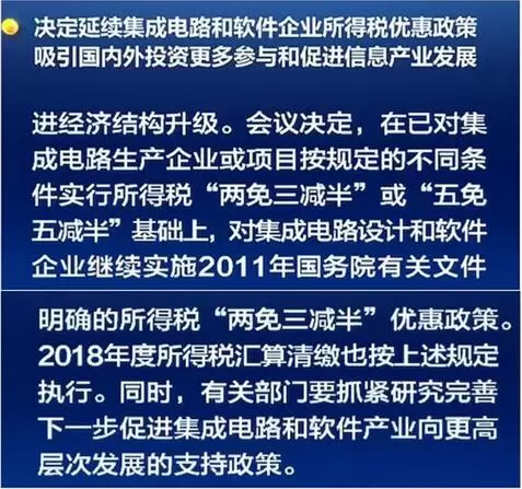 会议决定,在已对集成电路生产企业或项目按规定的不同条件分别实行企业所得税“两免三减半”(即第一年至第二年免征、第三年至第五年减半征收)或“五免五减半”(即第一年至第五年免征、第六年至第十年减半征收)的基础上,对集成电路设计和软件企业继续实施2011年《国务院关于印发进一步鼓励软件产业和集成电路产业发展若干政策的通知》中明确的所得税“两免三减半”优惠政策。2018年度所得税汇算清缴也按上述规定执行。