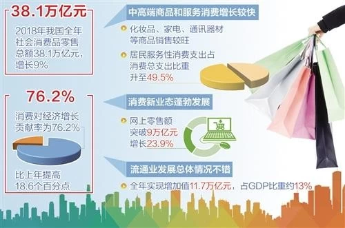 商务部数据显示,2018年全年社会消费品零售总额达38.1万亿元,其中消费新业态蓬勃发展,现代供应链、电子商务、数字消费等互相融合,网上零售额突破9万亿元,增长23.9%。在贡献率方面,2018年消费对经济增长的贡献率为76.2%,连续5年成为经济增长第一动力;另据腾讯金融科技智库日前发布的《见证2019•百位经济学家问卷调查报告》指出,综合考虑宏观政策、经济增长速度、CPI、消费、互联网+、人工智能等多方面因素,认为2019年经济增速将小幅放缓,消费升级与新经济则是经济增长的新引擎。