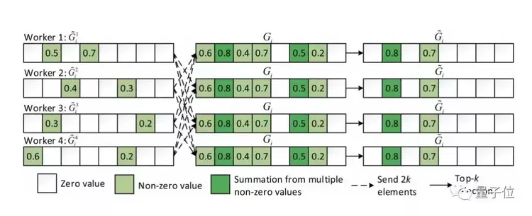 因此,每次通信需要传输 2k个值(梯度值和索引)。采用AllGather对这2k个值进行聚合(简称TopKAllReduce)则需要O(kP)的通信复杂度。当扩展到大规模集群时(即P很大),即使k较小也仍会产生显着的通信开销。