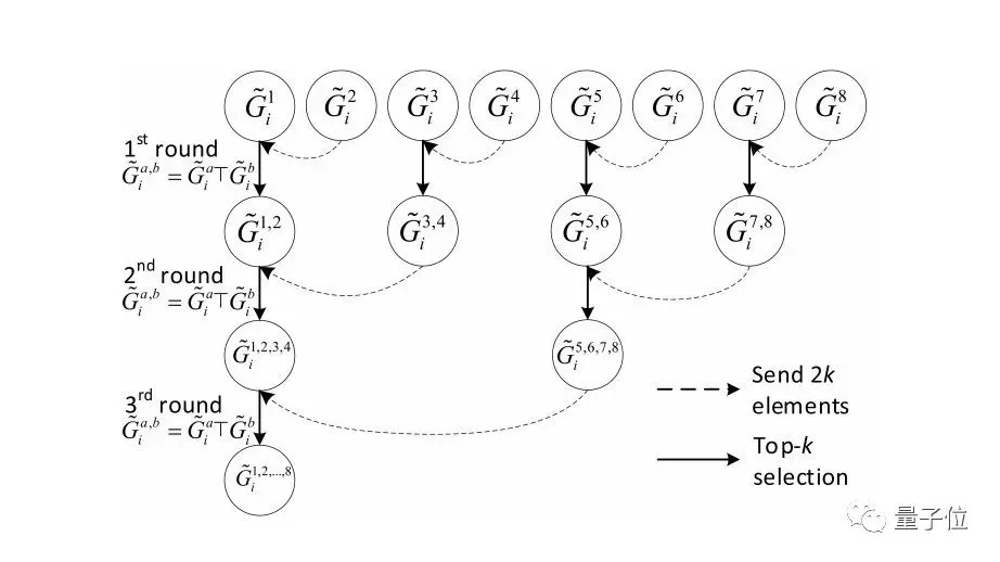 利用树状结构进行两两通信,每次只传输k个非0值,而接收者则会有2k个值,为下次传输也只传输k个值,接收者从2k个值中再选出k个值传递给下一个接收者。由于两两通信是可以同时进行,因此对于P个节点,只需要logP轮通信,一个8节点的示例如图3所示。
