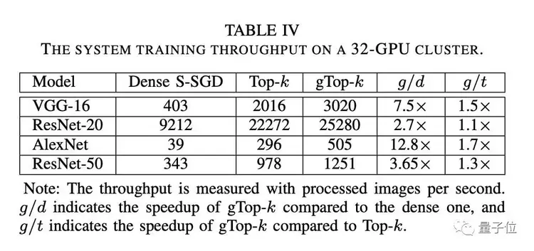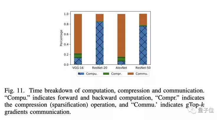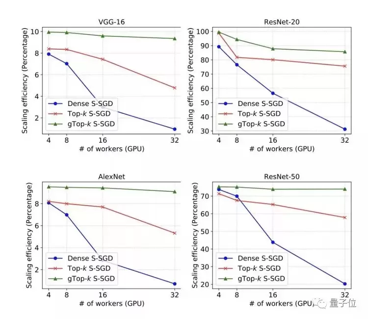 此外,应注意梯度稀疏化所用的时间是与VGG-16和AlexNet型号的计算时间相当。主要原因是GPU上的Top-k选择效率低下,并且在SIMD架构上高度并行化可能并非易事。研究人员将此作为未来的优化方向。