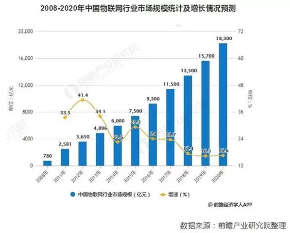 据前瞻产业研究院发布的《中国物联网行业应用领域市场需求与投资预测分析报告》统计数据显示,2008年中国物联网行业市场规模仅仅达780亿元。2011年中国物联网行业市场规模增长达到2581亿元。2014年中国物联网行业市场规模首次突破6000亿元,同比增长22.6%。截止至2017年中国物联网行业市场规模增长突破万亿元。初步测算2018年中国物联网行业市场规模达到1.35万亿元左右。预测2019年中国物联网行业市场规模将超1.5万亿元,达到15700亿元。物联网作为通信行业新兴应用,在万物互联的大趋势下,市场规模将进一步扩大。并预测在2020年中国物联网行业市场规模将突破1.8万亿元,而全球物联网行业市场规模则将达1.7万亿美元。