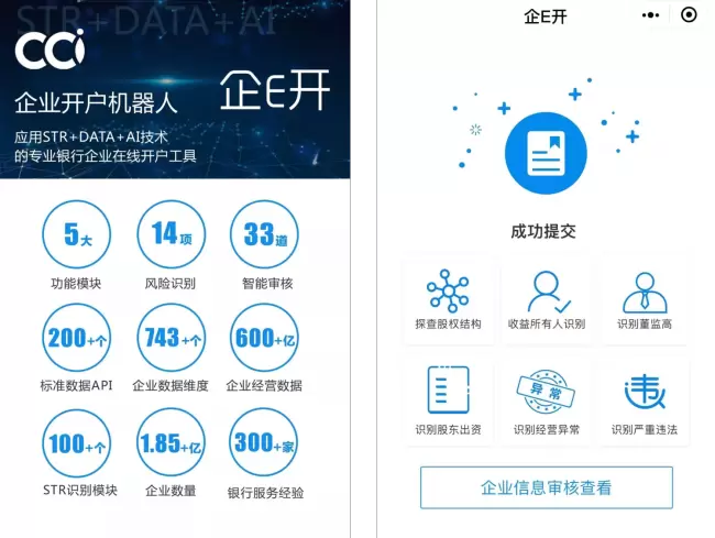 基于以上痛点,合合信息推出的“企e开”开户机器人,集成人工智能STR识别、人脸识别、商业大数据API、数据服务等技术,优化企业开户流程,提高实时风控能力。以“全自动、全天候、数据化”为特点,“企e开”为企业客户提供优质、高效的开户体验,真正实现对公客户风险实时掌控管理。
