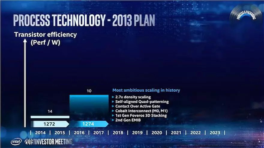 早在2013年,英特尔就设想通过提供2.7倍密度的自对准四轴图形(SAQP)、有源门上触点(COAG)、Cobolt互连以及EMIB和Foveros等新的封装技术,使其10nm芯片在14nm芯片上取得成功。英特尔承认,这是一个雄心勃勃的计划,目标没有与团队进行明确的界定,以至于最终过于复杂,没有以理想的方式进行管理。
