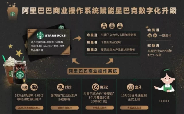 具体以星巴克为例,星巴克曾在两年前选择与微信合作,一度微信九宫格中还出现过星巴克的限时推广,不过星巴克与支付宝合作之后开始逐渐更倾向于支付宝小程序。笔者作为星巴克的资深用户,分别体验过(微信小程序)“星巴克用星说”和(阿里系小程序)“星巴克中国”;后者在支付宝、淘宝、天猫、饿了么、盒马鲜生等App中搜索到这一小程序,星巴克与饿了么合作“专星送”(类似KFC的“宅急送”),帮助星巴克扩展了外卖到家业务,直接给星巴克带来更带复利价值的用户流量和业务订单;并且通过支付宝小程序这一产品载体把阿里巴巴商业操作系统中各项能力赋能给了线下各个星巴克门店,帮助星巴克实现会员通、权益通的“新零售”改造升级。