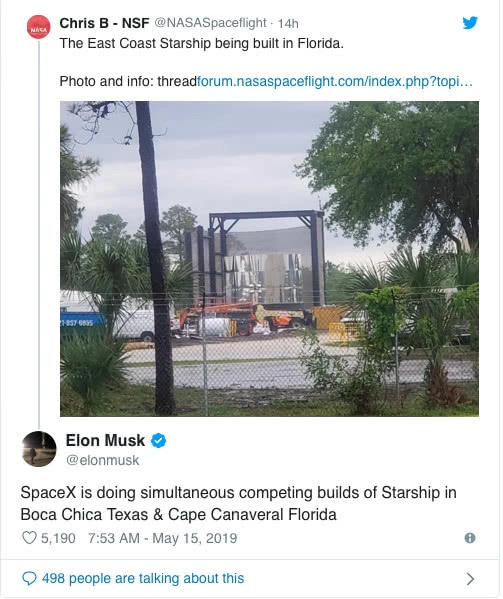 也是在同一天,马斯克在Twitter上证实,SpaceX正在德克萨斯州和佛罗里达州两地建造星际飞船原型。目前,该公司第一艘星际飞船原型机正在得克萨斯州南部建设,第二艘原型机在佛罗里达州也已处于早期整合阶段。