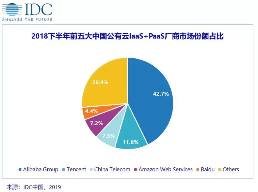 IDC在本月的一份报告中指出,中国的云服务、管理软件市场规模预计将在2023年扩张至6500亿美元。而在2018年下半年,阿里云占据国内公有云市场42.7%的份额,腾讯云(11.8%)和中国电信(7.5%)排名二三位。