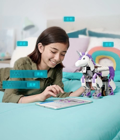 纯白、粉紫的产品配色,稳稳地抓住了5-12岁女孩“奇幻妙想”的心理;栩栩如生、活灵活现的“独角兽”,也实现了每个女孩对魔法的向往。此外,这也是一款寓教于乐的拼搭式编程机器人,女孩子们不仅能在拼搭和编程中去想象和创造各种魔力故事,还能跟人工智能编程科技近距离接触,教育意义不言而喻。