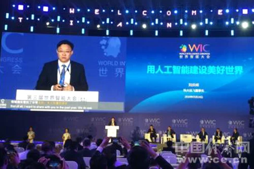 图为科大讯飞董事长刘庆峰在第三届世界智能大会上进行演讲。