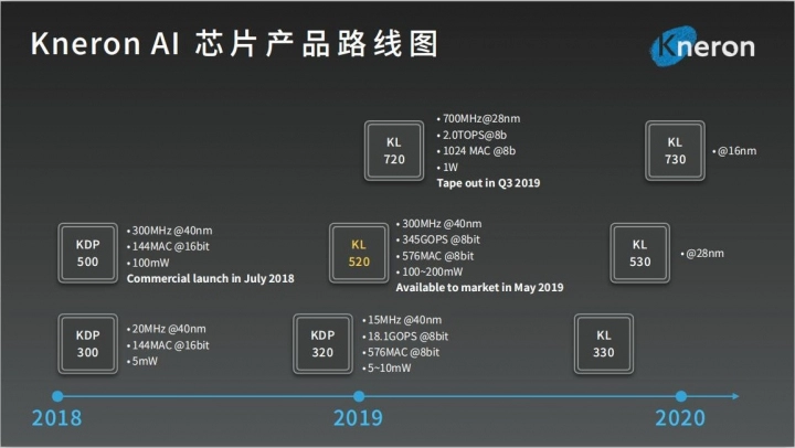 据透露,2019年第四季度,耐能将发布更高规格的第二款AI SoC——KL720。而2020年,“3代”KL330、KL530和KL730系列也将相继推出,其中KL530将采用28nm制程、KL730的制程则为16nm。