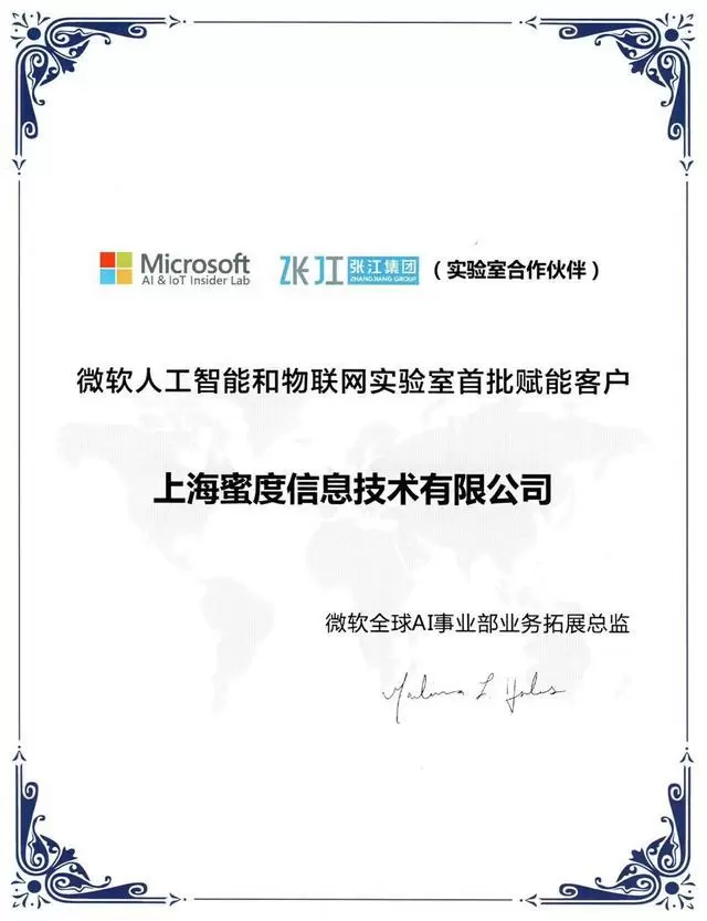 据了解,包括蜜度信息在内的首批30家被微软人工智能和物联网实验室赋能的企业,将在未来3-6个月得到微软的全方位支持,包括实验室提供的硬件及软件资源、微软云服务资源、接入微软生态系统与大中小产业资源实现联动等,同时这些被赋能的企业也将享受张江集团提供的创新及投资服务支持。