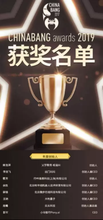 近日,由动点科技TechNode发起的ChinaBang Awards年度评选正式揭晓。本次年度创始人的选拔标准为:领导公司显著成长、商业指标明显提升或有重大突破(技术、体量、融资)。经过十位专业评委和上万名大众评委的联合投票评选,松鼠AI创始人栗浩洋从近千家报名企业中脱颖而出,成为ChinaBang Awards评选出的8位年度创始人之一。一同获奖的还有小红书创始人瞿芳、地平线机器人创始人余凯,小马智行CEO彭军等人。历届获奖的人有蔚来汽车李斌 、搜狗王小川等。