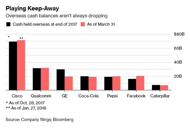 思科、高通、通用电气、可口可乐、百事可乐、Facebook和卡特彼勒2017年底与2018年3月海外现金储备量比较