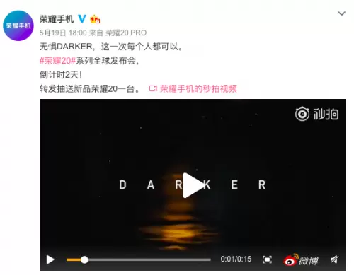 荣耀官方连续发布了三条荣耀20系列发布会倒计时视频, “CLOSER”、“更WIDER”、“无惧DARKER”,再一次表明荣耀20系列在长焦、超广角和夜拍上的三大摄影优势。
