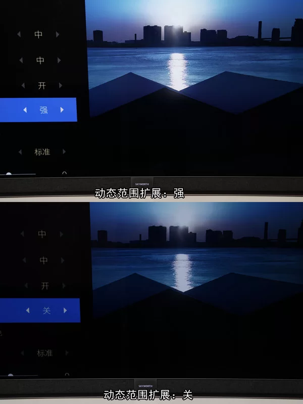 AI动态范围扩展,主要是对比度方面的提升。OLED屏与生俱来拥有极限对比度,结合变色龙AI芯片的智能处理,大幅提升画面的表现力。下图所示,开启该技术后,画面亮的地方更亮了,而与此同时,暗部的阴影细节——如远处的房子,竟然更清晰明显了。