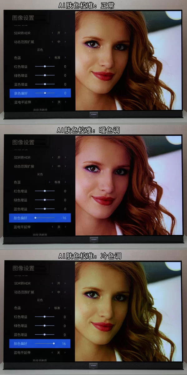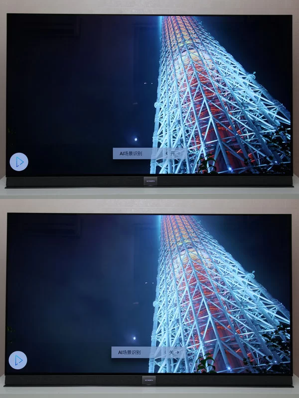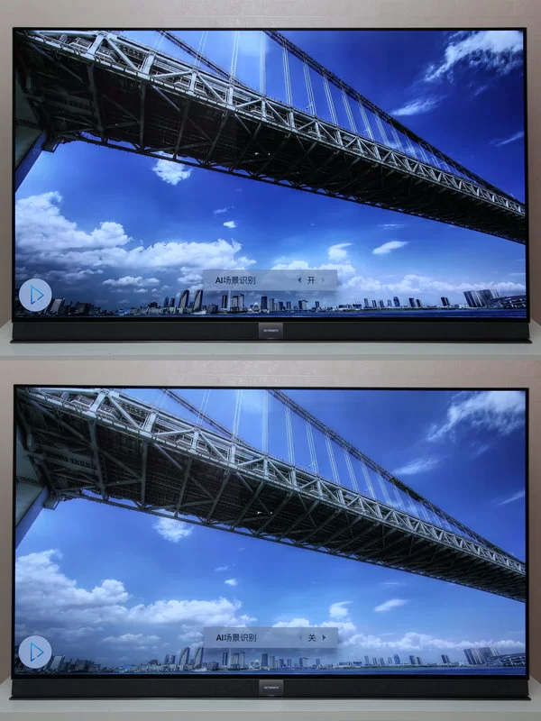 下图是我们在系统的图像设置里进行参数调校的对比,在实际播放画面中,AI芯片会自动进行处理。
