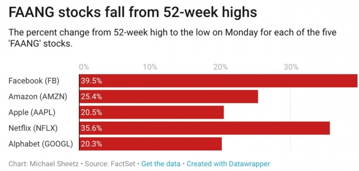 Facebook,Alphabet(谷歌的母公司),苹果,Netflix和亚马逊都陷入了熊市交易领域,这意味着这些股票的价值下滑超过20%。CNBC有一个方便的图表,说明美国最大的科技公司有多糟糕。