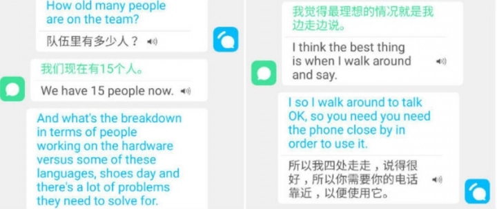 您可以通过应用程序选择语言,并且每个人都将一个语言放在耳边。这两个翻译器是难以区分的,但是用于识别第二个单元的点亮字泡泡标识上方的小线(“眉毛”)。