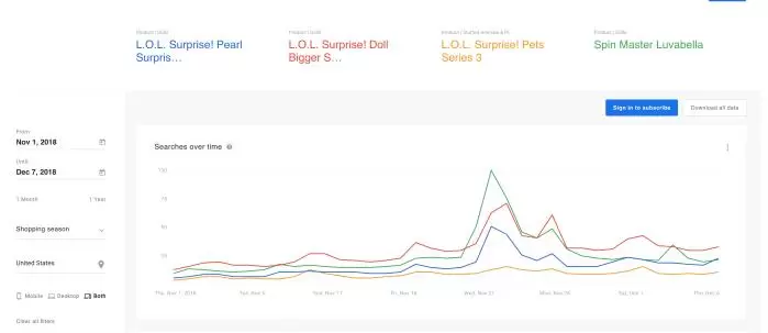 这个搜索数据也变成了现实世界的销售。虽然我们不得不等待假期结束以获得最终统计,但已经是L.O.L惊喜了!例如,玩具已经进入了亚马逊的假日玩具清单及其畅销产品。事实上,L.O.L。截至今日,令人惊讶的是亚马逊十大畅销玩具和游戏排行榜上的一半。 (并且他们已经在名单上的位置进一步受到阻碍:L.O.L惊喜!玩具也是13号和34号畅销书。)