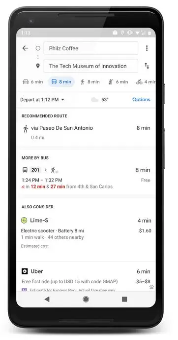 谷歌与Lime合作,在全球13个城市展示附近的自行车和踏板车。如果附近有Lime车辆,谷歌地图将显示到达车辆需要多长时间,车辆的估计价格和总行程时间。