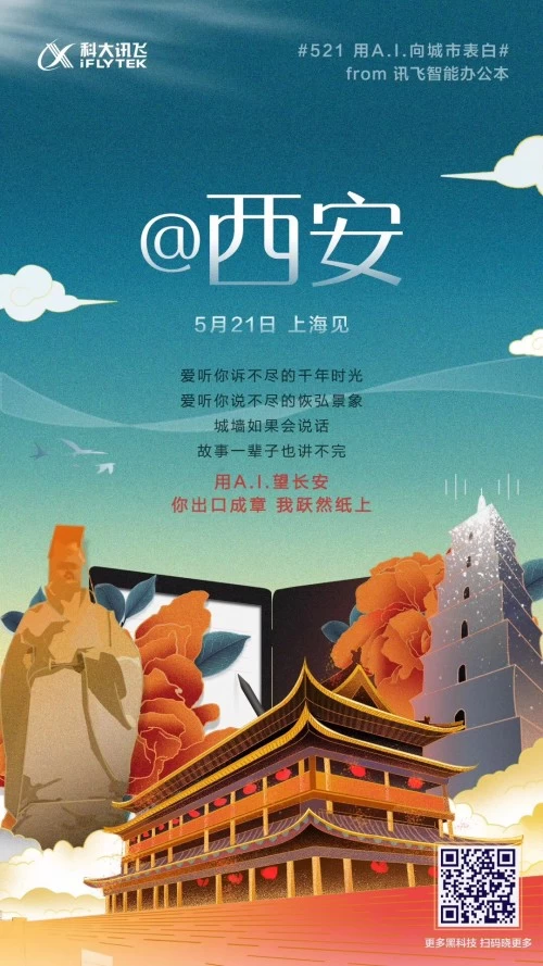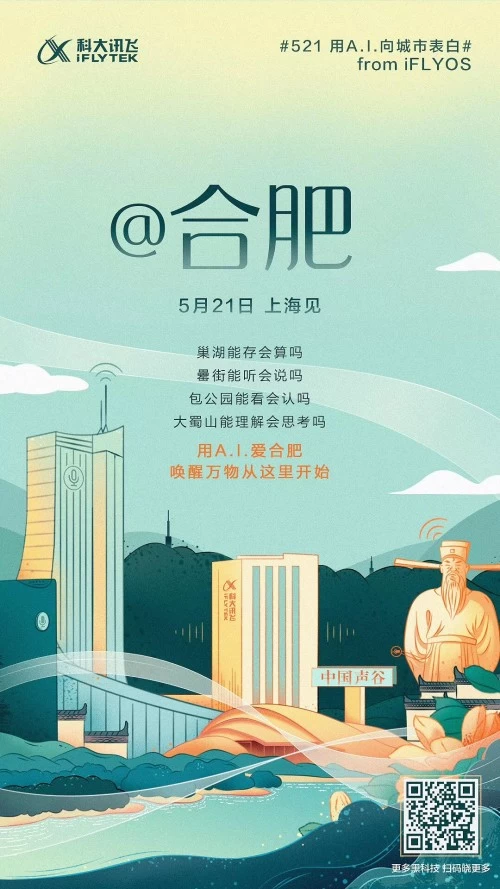 海报中,iFLYOS 在合肥问“大蜀山能理解会思考吗?”,讯飞听见在上海表示“能读懂老克勒内心的体面”,科大讯飞以产品告白的口吻,故事的笔触,讲述了这些身怀绝技的“黑科技”在不同城市落地生根、开花结果的故事。