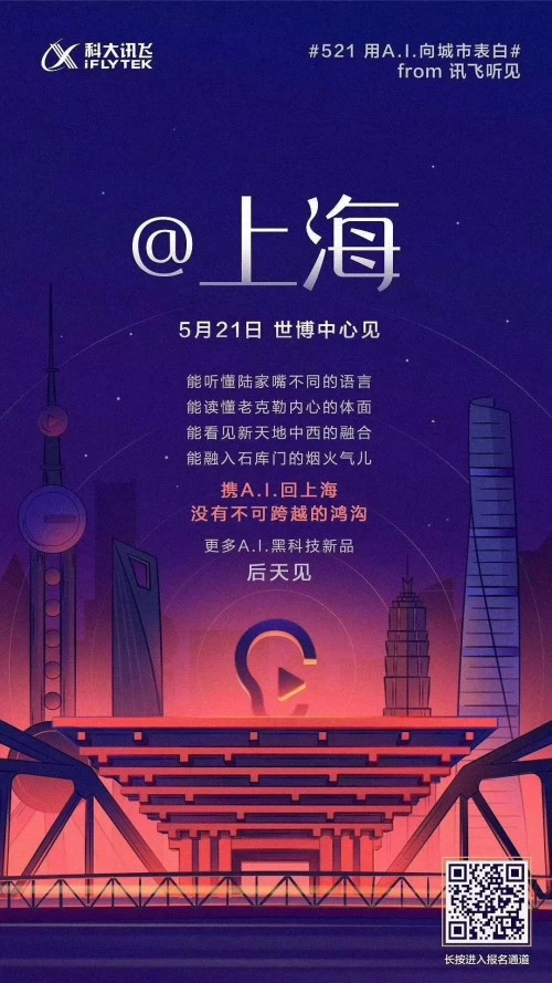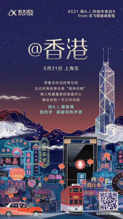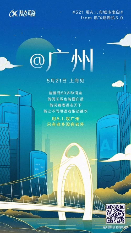 科大讯飞以#521用A.I.向城市表白#主题海报的形式,一口气“撩”了广州、合肥、西安、北京、上海、香港六座城市。笔者注意到,每张海报的城市名称下面都会出现“5月21日,上海见”字样,经过了解得知,这是科大讯飞在用“表白行动”,为2019新品发布会预热。
