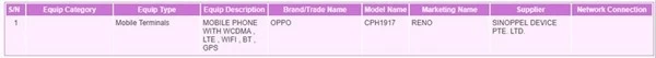 疑似OPPO Reno新机通过IMDA认证(图取自微博)