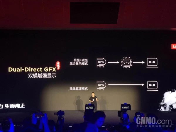 由于一些原因,发布会上对于性能方面并没有进行过多的介绍,更多是对联想的独家设计进行了讲解。首先就是Dual-Direct GFX双模增强显示,其中包括核显+独显混合显示模式以及独显直连模式。