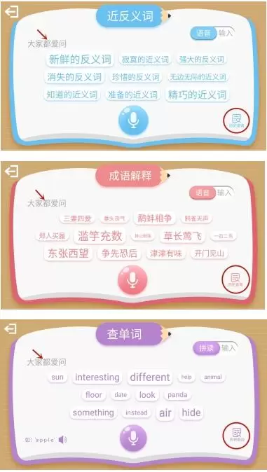 .“学习工具”板块中,成语解释、近反义词、查单词和中英互译上线全新界面,可查看历史记录,前三个功能中新增“大家都爱问”,中英互译增加“每日一问”;增加初中物理、化学微课堂栏目。