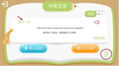 中英互译里还加入了“每日一句”,这些经典格言不仅有英文和中文翻译,还可以点开听标准的朗读。每天读一句,不仅能引导孩子树立正确的观念,还能让孩子下一次的英语作文里,添上更多的好句素材~