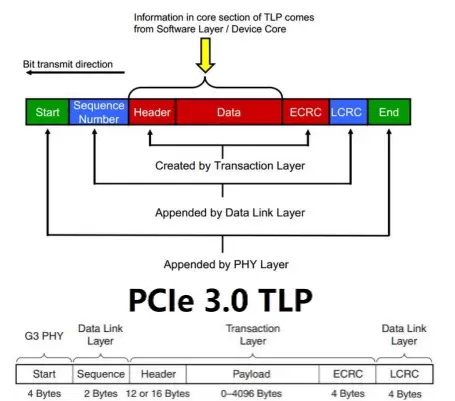 任何数据PCIe系统传输,都会产生一定的开销。PCIe设备是以TLP的形式发送报文的,数据报文在Device Core产生之后,在分别经过事务层(Transaction Layer)、数据链路层(Data Link Layer)、物理层(Physical Layer)之后会依次被增加ECRC,Sequence Number,LCRC,Start,END等数据块。