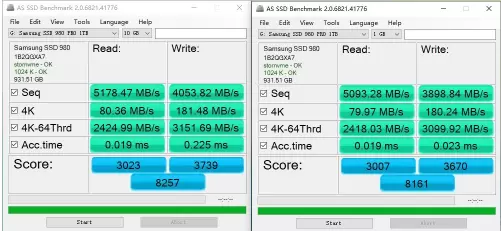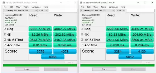 这是写入量已经达到32TB的三星980 PRO 1TB SSD,不论是顺序还是4K随机读写速度都出现了一定程度的下滑。总分也从9000分跌到了8200左右。