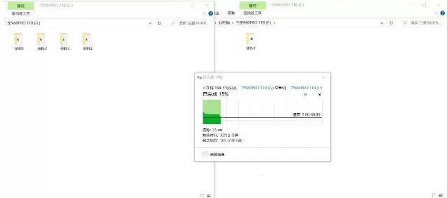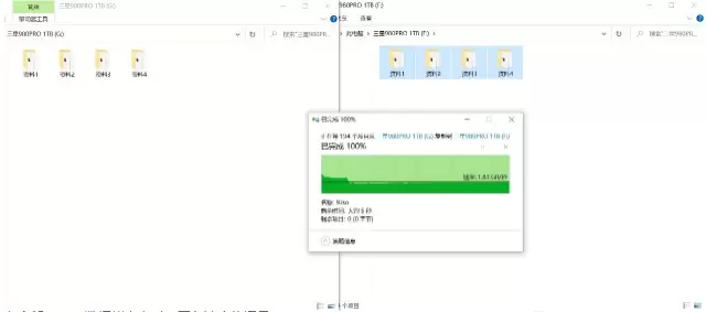 三星980 PRO 1TB SSD的实际容量是931GB,我们将890GB的数据从其中一块980 PRO 1TB SSD拷入到另外一块,看看这块SSD的缓外写入速度能有多高。