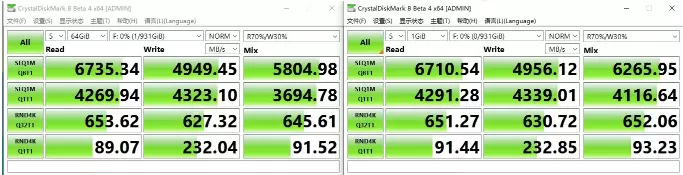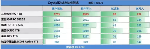 在CrystalDiskMark测试中,三星980 PRO 1TB SSD的顺序读取速度达到了惊人的6735MB/s,写入速度也有4949MB/s;4K读写速度分别为89MB/s和232MB/s。
