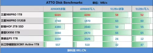 在对4096KB大小的文件进行读写时,三星980PRO 1TB的读取速度比影驰HOF 2TB快了1640MB/s,写入快了260MB/s。