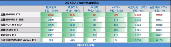 在4K性能方面,三星980PRO 1TB的读取速度达到了82MB/s,写入202MB/s,均傲视群雄。
