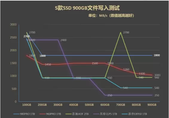 上图是汇总的数据,三星980PRO 1TB SSD无疑是最稳定的,到最后一直都保持着1.8GB/s的写入速度。