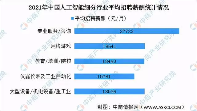 从行业来看,专业服务/咨询行业人工智能岗位平均招聘薪酬最高达27722元/月,网络游戏、教育/培训/院校、大型设备/机电设备/重工业人工智能岗位平均招聘薪酬超1.8万。