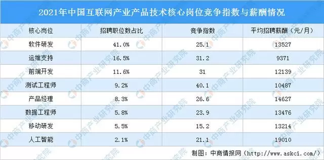 人工智能人才供给尚不完善,竞争热度低、招聘薪资高。据智联招聘发布的《2021年互联网产业求职指南》,2021年人工智能人才平均工资19010元/月,远高于互联网产业产品技术核心岗位。