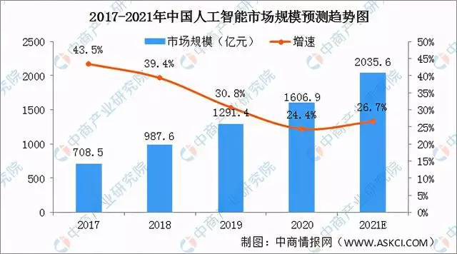 中国是全球最大的人工智能应用市场,人工智能技术落地迅速,已广泛应用于多个行业和场景,应用市场潜力巨大,未来将在现有行业更加深入应用并触达更多行业场景。预计2021年中国人工智能市场规模将突破2000亿元。