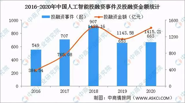 随着我国对人工智能的日益关注,带动着投资行业也开始关注这一热门。2016年以来,我国人工智能投融资活跃。2020年投融资事件663起,投融资金额1415.21亿元,近三年投融资金额均超1000亿元,投融资事件呈现下降的趋势,由此看来,人工智能投融资更加理性,资金流向头部项目的趋势明显。