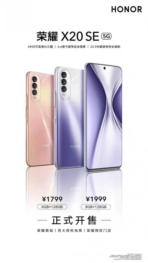 7月9日10:08,荣耀X20 SE正式开售。6GB+128GB版本售价1799元,8GB+128GB版本售价1999元,并提供幻夜黑、钛空银、樱粉金、蓝水翡翠四种配色可选。用户登陆荣耀商城、各大授权电商平台,或前往线下荣耀体验店均可同步选购。