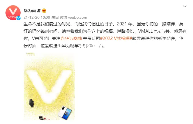 小编惊喜地发现,华为商城已经拉开新年祝福的序幕,推出了“2022 V式祝福”的暖心活动,12月20日-12月31日 @华为商城 官方微博联手多家品牌在新年来临之际共同为商城粉丝们送上祝福,每日参与粉丝互动还有机会获得华为AI音箱、华为mini蓝牙音箱等礼品。新年的讯息已经发送,你接收到了吗?