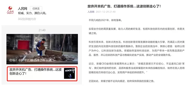 如前所述,荣耀智慧屏在去年年末再度因“开关机无广告”的产品理念得到人民网的肯定。早在去年11月,人民网财经研究院发布的《2021年智能电视开关机广告调研报告》就已印证了消费者对智能电视开关机广告的不满态度。如今,智能电视有无开关机广告已成为消费者购买电视时的一项重要参考标准,作为用户体验的第一步和最后一步,开关机广告直接影响用户观感和对产品的喜爱程度,而荣耀智慧屏从根源上就为消费者关掉了开关机广告,让其本该有的自主选择权和良好观看体验得到了保障,也由此深受人民网等权威媒体的好评,为行业健康、有序发展树立了标杆。