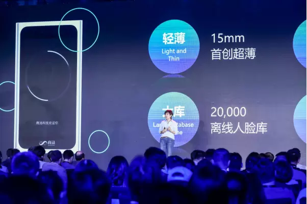 商汤科技联合创始人、技术执行总监马堃展示新一代SensePass,仅普通手机大小