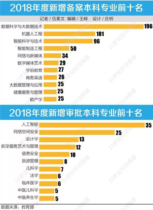 21世纪经济报道记者对《2018年度普通高等学校本科专业备案和审批结果》进行梳理发现,以机器人工程、人工智能为代表的工科专业,在这一轮高校专业调整中数量最多。