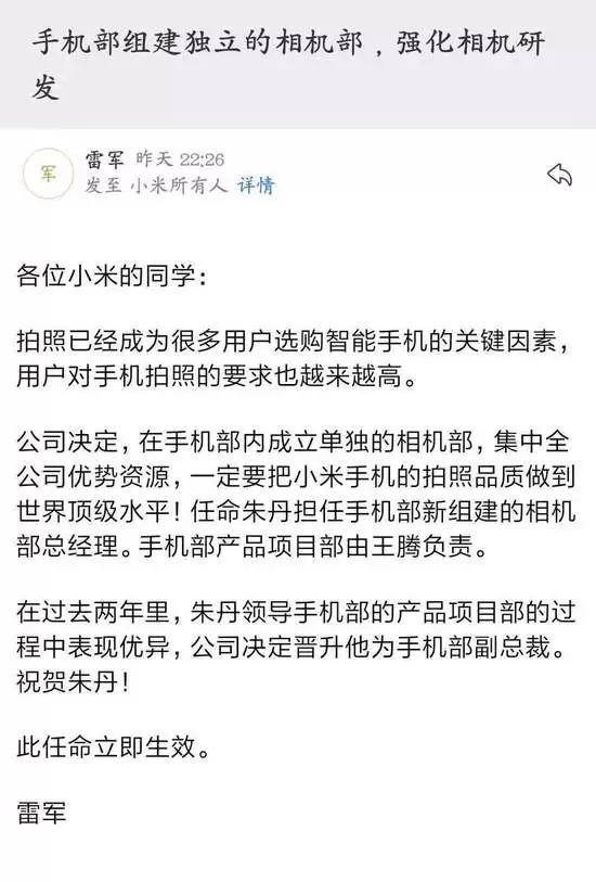 公司决定,在手机部内成立单独的相机部,集中全公司优势资源,一定要把小米手机的拍照品质做到世界顶级水平!任命朱丹担任手机部新组建的相机部总经理。手机部产品项目部由王腾负责。